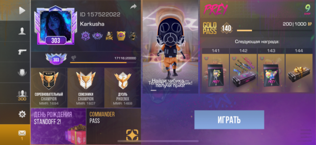 - 303 lvl + st рамка - набор медалей - >1000 часов в игре - ранговые игры: Чемпион, Чемпион, Рейнджер - 2 ножа и 2 пары...