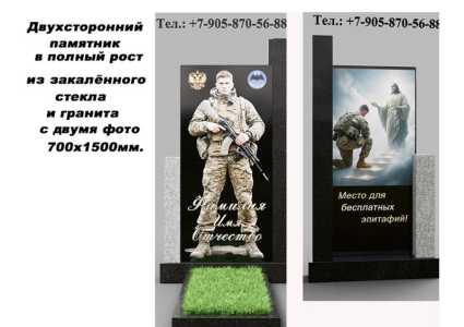 Двухсторонний памятник в полный рост герою СВО из закалённого стекла и гранита с двумя фото 700х1500мм. 1.
