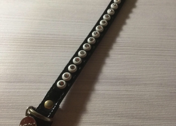 Ошейник кожаный чёрный. Декор: стразы. Максимальный диаметр: 7,5см. Надевался один раз, на выставку.